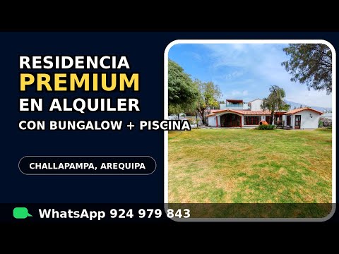<p>Residencia Premium en alquiler – Urb. Santa Sofía, Challapampa, Arequipa</p><p></p><div>Precio: US$ 3,000/mes</div><div>Área de terreno: 1,380 m²</div><div>Área construida: 350 m²</div><div><br></div><div>Descripción</div><div><br></div><div>Residencia de gran formato con jardines amplios, piscina, zona de parrilla y bungalow adicional para visitas o ambiente social/familiar. Excelente clima y vista hacia el volcán Misti.</div><div><br></div><div>Distribución – Casa principal</div><div><br></div><div>Sala amplia y comedor independiente, ambos con salida y vista hacia piscina</div><div><br></div><div>Cocina cómoda con muebles altos/bajos + despensa</div><div><br></div><div>Baño de visitas</div><div><br></div><div>Área de servicio: lavandería + cuarto y baño de servicio</div><div><br></div><div>3 dormitorios (2 con baño incorporado) + baño familiar</div><div><br></div><div>Closets amplios tipo walking closet con espejos</div><div><br></div><div>Bungalow / Casita de visitas</div><div><br></div><div>Sala amplia</div><div><br></div><div>Ambiente para dormitorio</div><div><br></div><div>Kitchenette</div><div><br></div><div>1 baño</div><div><br></div><div>Oficina lateral + área de depósito</div><div><br></div><div>Exteriores</div><div><br></div><div>Jardines con vegetación y árbol central</div><div><br></div><div>Zona de parrilla</div><div><br></div><div>Espacio construido para mascotas</div><div><br></div><div>Cochera para varios autos (opción adicional en área de césped)</div><div><br></div><div>Informes y visitas: Avanza Gestión Inmobiliaria – 924 979 843</div><div><br></div> <br> <p></p>